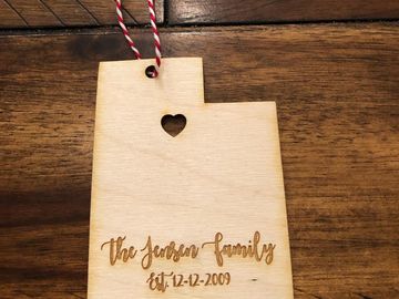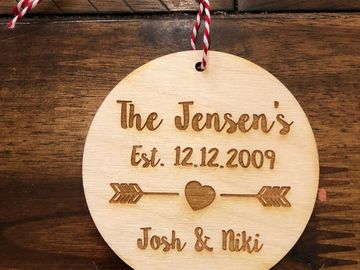 Custom photo engraved ornament on 3" wood shaped ornament.